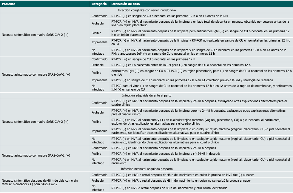 De acuerdo con los antecedentes, el cuadro clínico, el resultado de pruebas moleculares, la microscopía electrónica y las pruebas serológicas, Shah et al.46 propusieron un sistema de clasificación de caso de infección por SARS-CoV-2 en el neonato, de acuerdo con las siguientes definiciones: confirmado (evidencia fuerte de infección con microbiología confirmatoria), probable (fuerte evidencia de infección pero sin microbiología confirmatoria), posible (evidencia sugestiva de infección, pero incompleta), improbable (poco sustento para el diagnóstico pero la infección no puede ser totalmente descartada) y no infectado (sin evidencia de infección) (Cuadro II).