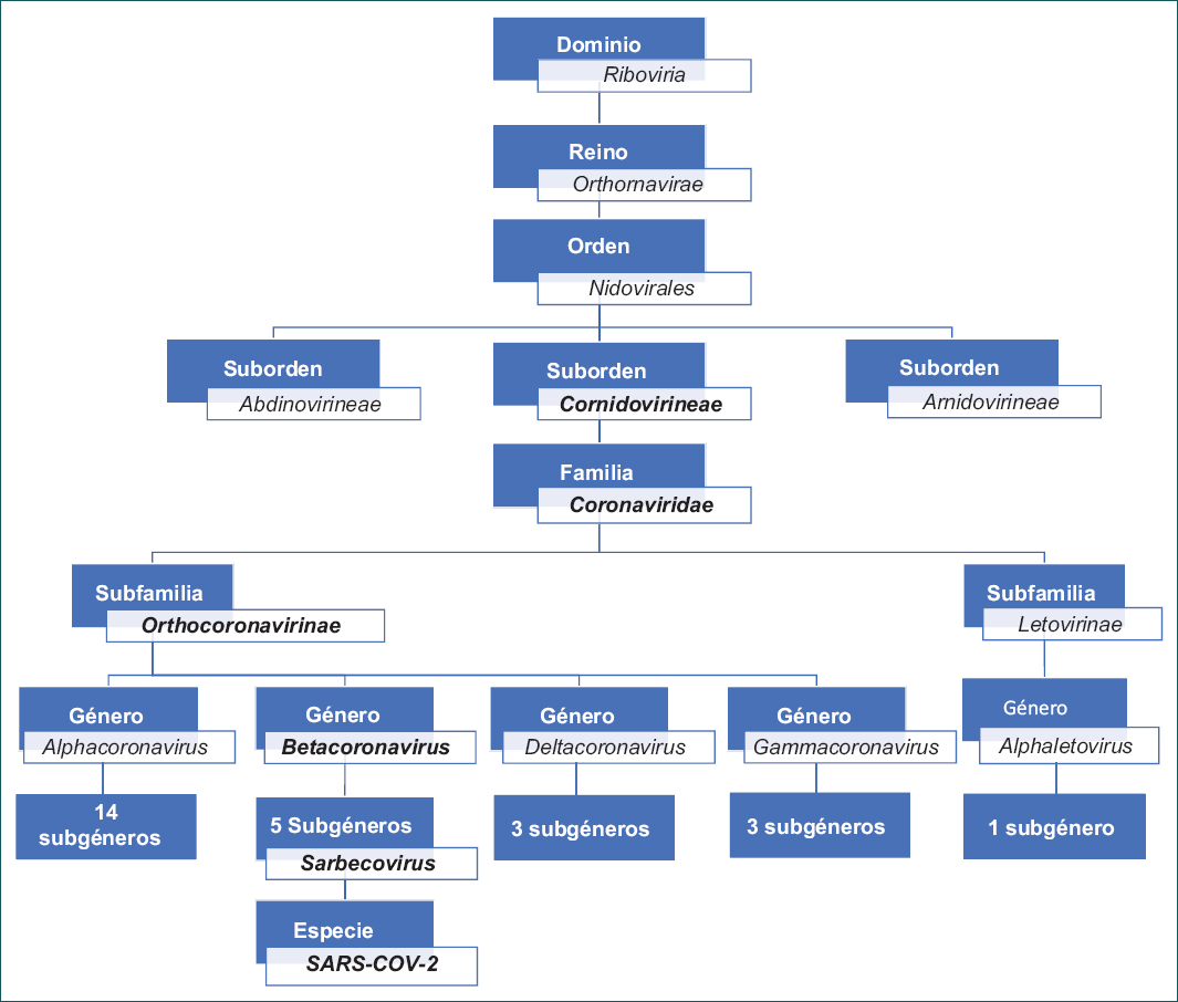 La familia de los CoV ha adquirido gran relevancia durante las últimas dos décadas por las epidemias y pandemias que han aquejado a la humanidad. La clasificación actual de los CoV reconoce 46 especies en 26 subgéneros, cinco géneros y dos subfamilias que pertenecen a la familia Coronaviridae.24 Se trata de una familia de virus con envoltura, una cadena positiva (sentido 5´-3´) de ARN con morfología esférica que infecta a vertebrados.17 El SARS-CoV-2, causante de la pandemia actual (COVID-19), es un CoV del reino Riboviria, orden Nidovirales, suborden Cornidovirineae, familia Coronaviridae, subfamilia Orthocoronavirinae, género Betacoronavirus, subgénero Sarbecovirus, especie Coronavirus 2 del Síndrome Respiratorio Agudo Grave (Fig. 1).20