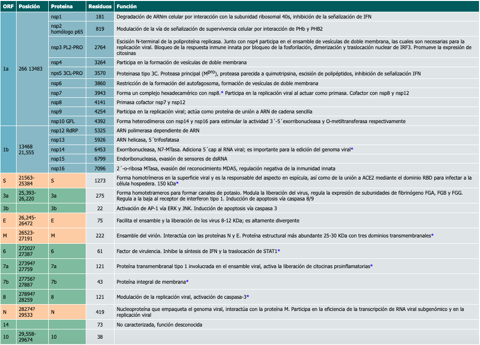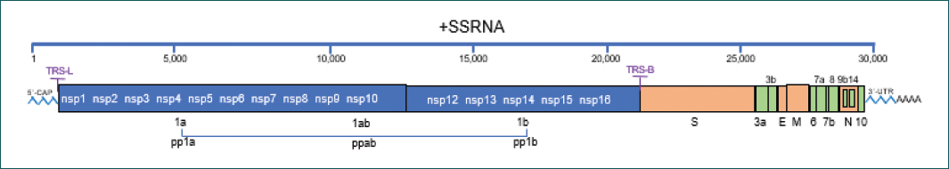 Los CoV son virus envueltos, es decir, presentan una membrana lipídica que forma partículas de entre 100-160 nm de diámetro. Su genoma consta de una sola cadena de ARN positiva, que les permite llevar a cabo la traducción de manera directa después de la infección, sin necesidad de ningún intermediario. La cadena de ARN contiene entre 27 y 32 kb; son los virus de ARN con los genomas más grandes pero esto representa un genoma 100 000 veces menor que el genoma humano. Los viriones son esféricos y su particular característica son las proyecciones en forma de espículas que emanan de la superficie, lo que les da una apariencia de corona solar y de ahí su nombre.25 En general tienen de seis a 11 marcos de lectura abiertos (ORF, por sus siglas en inglés). El primer ORF representa aproximadamente 67% del genoma y codifica 16 proteínas no estructurales (nsp); los restantes ORF codifican proteínas accesorias y estructurales, que son especie-específicas e indispensables para la replicación viral.25,26