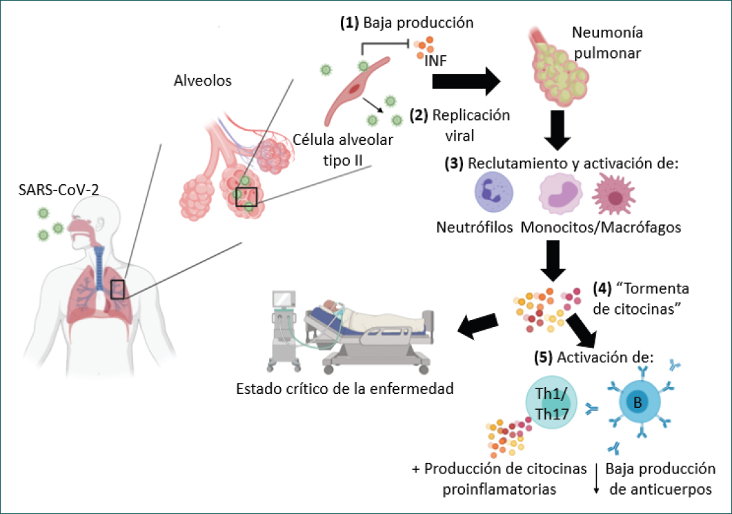 Una disminución de la respuesta inicial antiviral trae como consecuencia la replicación viral y el reclutamiento de neutrófilos y monocitos-macrófagos, así como la disminución de linfocitos, lo cual se ha observado en pacientes con COVID-19 que desarrollan la enfermedad de manera severa e incluso con consecuencias fatales.57 La presencia de un número elevado de células de la respuesta inmune innata incrementa los niveles en plasma de citocinas como IP-10, MCP-1, MIP-1A y TNFalfa, lo cual trae por consecuencia una “tormenta de citocinas” que se relaciona con la gravedad de la enfermedad.58 Más aún, se ha postulado que en este microambiente proinflamatorio, linfocitos específicos Th1/Th17 podrían ser activados y contribuir a la amplificación de la respuesta inflamatoria,59 aunque también se puede observar una respuesta disminuida de producción de anticuerpos específicos capaces de reconocer al virus, que podrían ayudar a su neutralización. No obstante, la presencia de citocinas antiinflamatorias Th2 (IL-4, IL-5, IL-10) puede favorecer la replicación viral.60 Se considera que una respuesta inmune deficiente en la producción de IFN y, por lo tanto, la falta de control viral en etapas iniciales, es uno de los mecanismos responsables del desarrollo de estados críticos en aquellos pacientes con diabetes, hipertensión y enfermedades cardiovasculares.61