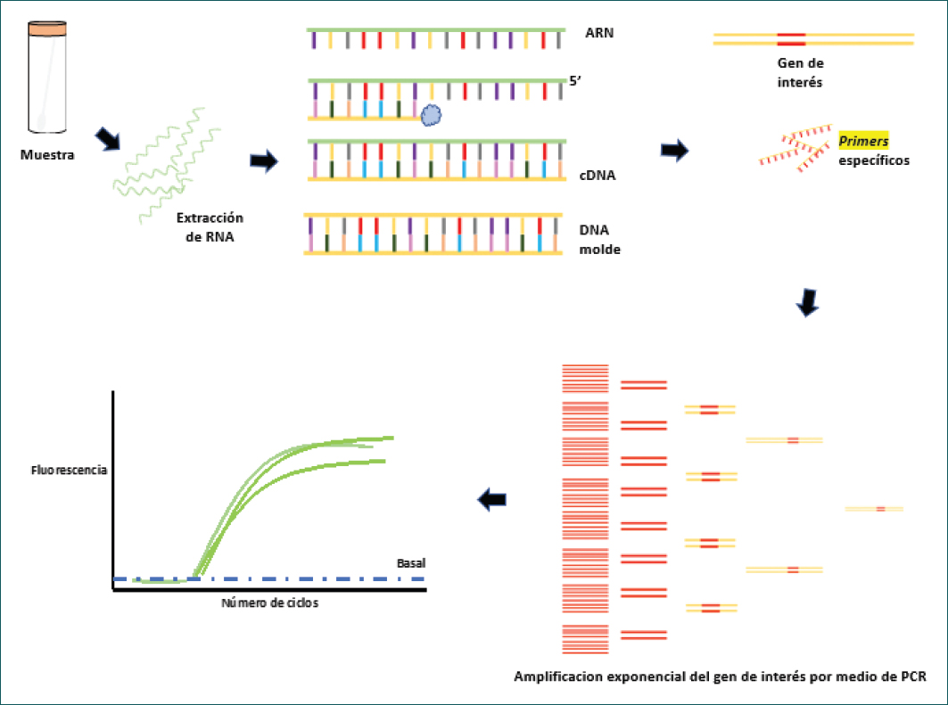- Detección de los productos amplificados, al cuantificar en tiempo real los productos obtenidos en cada ciclo de amplificación, lo cual se logra al incorporar una molécula fluorescente que se asocia con el producto amplificado (PCR en tiempo real o Q-PCR). En algunos casos, la detección se podría hacer a través de la incorporación de colorantes intercalantes (o moléculas radioactivas), detectados mediante un analizador de imágenes en lo que se conoce como RT-PCR en punto final.91,92