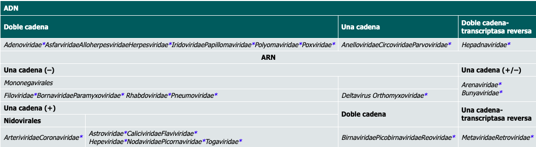 Los estudios moleculares y estructurales (y, más recientemente, los genómicos) han demostrado una extraordinaria diversidad dentro del mundo de los virus. Al igual que los seres vivos, los virus se clasifican de manera taxonómica por reino, filo, clase, orden, familia, género y especie (Fig. 1).22 Actualmente se han identificado más de 100 familias de virus, incluyendo aquellos de ADN de doble cadena (ds-DNA, como los adenovirus), de una cadena (ss-NA, como los parvovirus), ss-DNA-positivo (sentido 5´-3´), ss-DNA-negativo (antisentido 3´-5´) y ds-DNA-transcriptasa reversa (ds-DNA-RT, como los hepadnavirus). Entre los virus de ARN se encuentran ds-RNA (como los reovirus), ss-RNA(+) (como los picornavirus), ss-RNA(-) (como los ortomixovirus), los ss-RNA-RT (como los retrovirus) y los viroides (pequeñas cadenas circulares de ARN, carentes de proteínas y lípidos).17