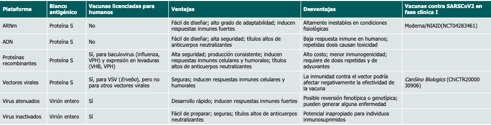 Durante la pandemia del virus de la influenza AH1N1 en 2009, los productores de vacunas cambiaron rápidamente sus estrategias de producción de vacunas trivalentes contra el virus de la influenza estacional, a vacunas monovalentes pandémicas. Aunque esto solo implicó un cambio de cepas y procesos establecidos y aprobados para la liberación y distribución de la vacuna, pasaron seis meses para que la vacuna estuviera disponible y esta también llegó tarde para afrontar la segunda ola de la pandemia, que tuvo lugar en Estados Unidos en otoño de 2009.97 En esta ocasión, ante la pandemia de COVID-19, nos enfrentamos a un extraordinario desafío ante un virus que acaba de emerger y que es capaz de infectar a los humanos. La respuesta es muy complicada porque en la actualidad no existen vacunas contra CoV.