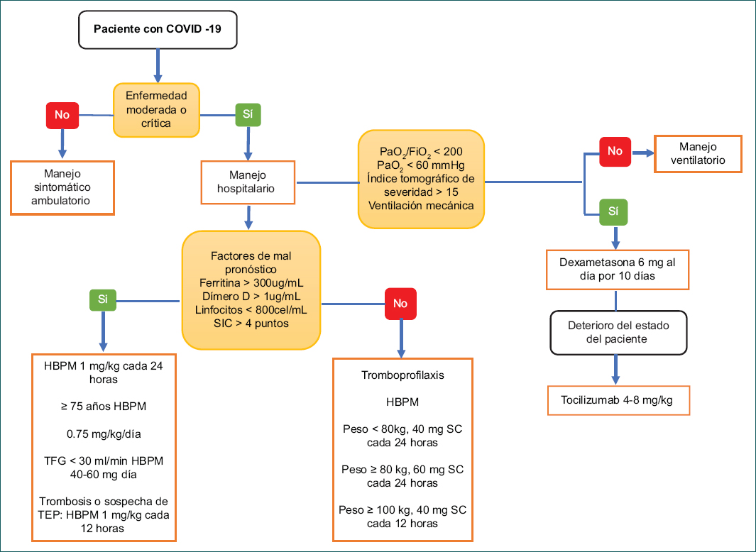 - Se recomienda recibir tromboprofilaxis con HBPM en todo paciente hospitalizado (0.5 mg/kg/día) y en pacientes con alto riesgo (puntuación SIC ≥ 4, ferritina > 300 ug/mL, dímero D > 1ug/mL, linfopenia < 800 cel/dL) se recomienda el uso de anticoagulación a dosis de 1 mg/kg/día. En caso de evidenciar o sospechar la presencia de tromboembolia pulmonar, usar anticoagulación plena (1 mg/kg, cada 12 horas)