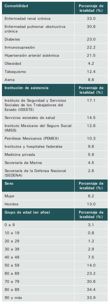 En nuestro país, el porcentaje de letalidad es mayor en pacientes con las comorbilidades más asociadas a enfermedad cardiovascular (Cuadro I).10 Al igual que en el resto de los países, la letalidad es mayor en hombres. Otros factores asociados a mayor letalidad son la edad y la institución del sistema de salud donde se atienda a los pacientes (Cuadro I).10