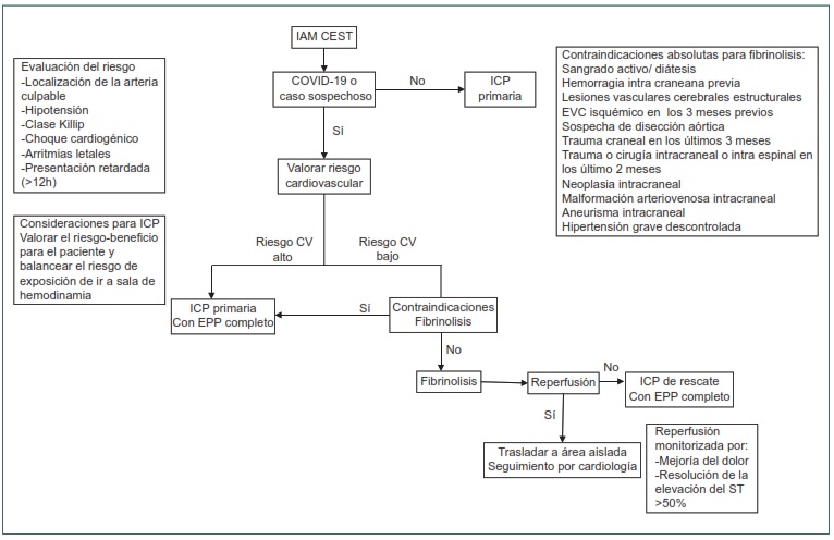 El 20 de abril de 2020 se publicó en la revista JACC, un consenso de la Sociedad de Angiografía e Intervenciones Cardiovasculares, el Colegio Americano de Cardiología y el Colegio Americano de Médicos de Urgencias, sobre el manejo del IAM-CEST durante la pandemia por COVID-19.23 En este documento, se enfatiza que: