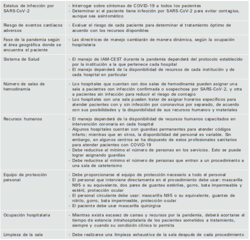 En marzo de 2020, la Asociación Americana del Corazón (American Heart Association), a través de la revista Circulation, recomendó que se cumplan a totalidad las recomendaciones33 que a continuación se enlistan, cuando los pacientes confirmados o con sospecha de COVID-19 tengan alguna de las condiciones cardiovasculares graves que requieran intervención quirúrgica o en sala de hemodinamia de emergencia: infarto agudo al miocardio con inestabilidad hemodinámica, infarto agudo al miocardio sin elevación del ST potencialmente letal con indicación urgente de revascularización, disección aórtica aguda tipo A o tipo B compleja, bradiarritmias complicadas por síncope o inestabilidad hemodinámica que requieran la implantación de un marcapasos o tromboembolia pulmonar con inestabilidad hemodinámica en donde la trombólisis tenga un alto riesgo de condicionar sangrado intracraneal.