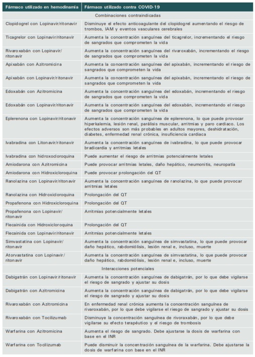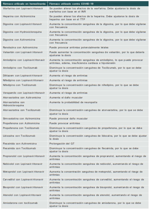 Interacciones entre fármacos utilizados en hemodinamia y tratamientos utilizados en COVID-19