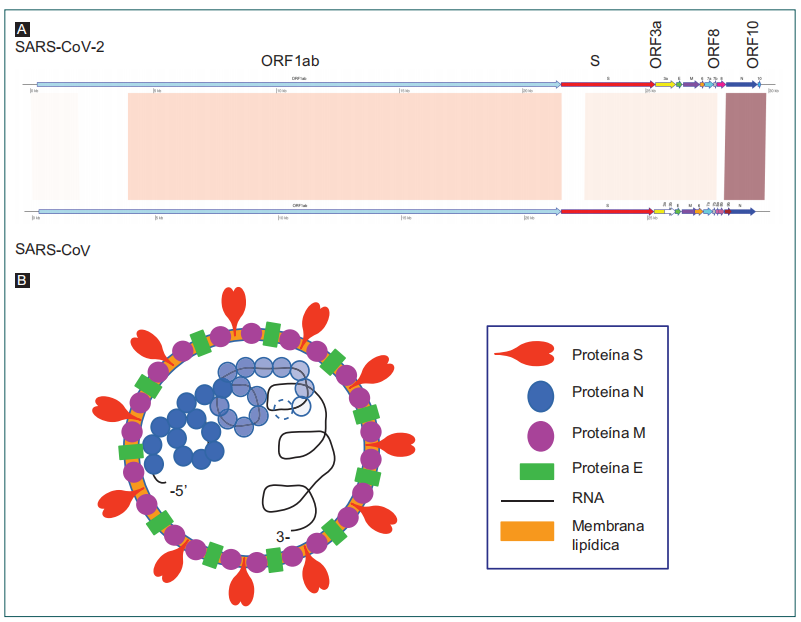 A: representación esquemática donde se observa la comparación del genoma de SARS-CoV-2 con SARS-CoV. Representación esquemática del alineamiento de los genomas que se han publicado en la base de datos de la National Center for Biotechnology Information (números de acceso: NC_045512.2 y NC_004718.3 respectivamente). Las flechas indican la orientación del marco de lectura. Las bandas de color que conectan a ambos genomas señalan las regiones de homología. La intensidad de color esquematiza el grado de similitud a nivel de la secuencia de nucleótidos. La comparación se realizó con BLASTN y la ilustración fue diseñada en R con la ayuda de la paquetería GenoPlotR. ORF1ab: marco de lectura abierto del gen 1ab; S: secuencia codificante de glicoproteína de membrana; ORF3a: marco de lectura abierto del gen 3a; ORF8: marco de lectura abierto del gen 8; ORF10: marco de lectura abierto del gen 10. B: ilustración en la que se esquematiza la estructura del virión; en ella se representan las principales proteínas de envoltura y de la nucleocápside.