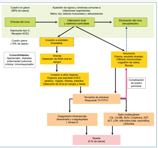 La enfermedad de COVID-19 se genera cuando el virus SARS-CoV-2 causa una infección pulmonar; en ella, el 80% de los pacientes desarrollan una respuesta inflamatoria local moderada que permite eliminar al virus; no obstante, el 20% restante sufrirá de las formas moderadas a graves que pueden culminar en la muerte. La presencia de comorbilidades favorece las formas graves. El virus también puede dañar el endotelio, ocasionando una inflamación descontrolada, diseminación sistémica y daño multiorgánico. Las flechas negras indican el curso normal de la infección por SARS-CoV-2, la flecha roja indica una complicación del cuadro pulmonar y la flecha azul la recuperación del paciente. ACE2: enzima convertidora de angiotensina 2; Th17: linfocitos Th17; Th1: linfocitos Th1; Ck: citocinas; Ck-MB: creatina cinasa; BUN: nitrógeno ureico en sangre; AST: aspartato transaminasa; ALT: alanina aminotransferasa; LDH: lactato deshidrogenasa.