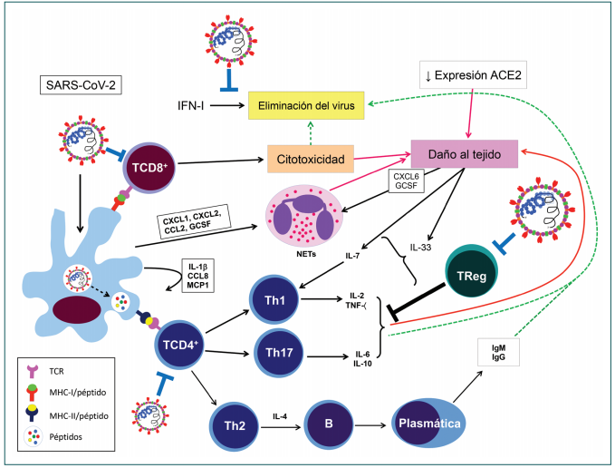 La replicación de SARS-CoV-2 disminuye la respuesta inmune mediada por el interferon de tipo I, este evento provoca que el virus replique fácilmente en el pulmón, donde se favorece su diseminación a otros órganos, con la consecuente transmisión entre individuos cercanos. Las flechas negras indican el curso normal de la infección por SARS-CoV-2, las flechas rojas indican las contribuciones al daño tisular, las flechas azules indican las comorbilidades en la replicación viral y las flechas verdes los eventos que contribuyen a la resolución de la infección. ACE2: enzima convertidora de angiotensina 2; Th1: linfocitos Th1; Th2: linfocitos Th2; Th17: linfocitos Th17; TCD4+: Linfocitos TCD4+; TCD8+: Linfocitos T CD8+, B: Linfocitos B; Plasmática: Células productoras de anticuerpos; TCR: Receptor del linfocito T; MHC-I: Moléculas del complejo principal de histocompatibilidad de clase I; MHC-II: Moléculas del complejo principal de histocompatibilidad de clase II.