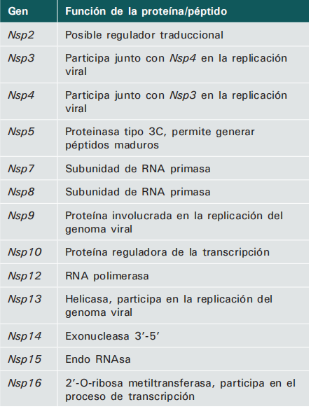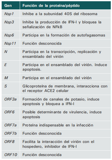 El SARS-CoV-2 está genéticamente relacionado con el SARS-CoV.. Los coronavirus son virus conformados por un genoma de RNA de polaridad positiva, poseen una nucleocápside helicoidal y una envoltura lipídica. Su genoma tiene un tamaño de 30 Kb y codifica para 11 genes que se traducen en 26 proteínas diferentes (Fig. 1A).4. El transcriptoma de SARS-CoV-2 muestra que además del mRNA de las proteínas canónicas, se transcriben varios RNAs reguladores que resultan de procesos de recombinación genómica y cuya función es desconocida.5. La envoltura lipídica proviene de la membrana celular del hospedero a la que se le incorporan proteínas virales de envoltura (E), de membrana (M) y de la espícula (S) (Fig. B). El virus utiliza la proteína S para reconocer al receptor de la enzima convertidora de angiotensina 2 (ACE2)6. e invadir a las células del hospedero, además, es la responsable de la forma de corona, característica del virión visto al microscopio y de la que deriva su nombre. La función de las proteínas codificadas en el genoma de SARS-CoV-2 fue inferida por homología con las proteínas de SARS-CoV (Cuadros I y II).5,7