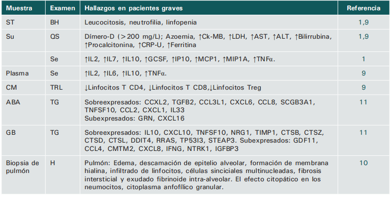 ST: sangre total; Su: suero; TG: transcriptogenómica; ABA: aspirado broncoalveolar; BH: biometría hemática; QS: química sanguínea; TRL: tipificación y recuento de linfocitos; GB: glóbulos blancos; Se: serología; H: histopatología, CM: citometría; CRP-U: proteina C reactiva ultrasensible; Treg: linfocitos T reguladores; Ck: citocinas; Ck-MB: creatina cinasa; AST: aspartato transaminasa; ALT: alanina aminotransferasa; LDH: lactato deshidrogenasa; IL: interlecucina; IFNG: interferon gamma