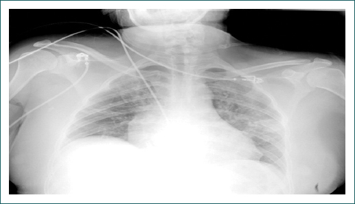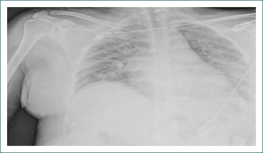 Nueve días antes de su ingreso, la paciente presentó odinofagia y tos no productiva, recibió tratamiento con ceftriaxona y betametasona a dosis no especificada, con persistencia de la sintomatología. Después, se agregaron disnea grado 3 en la escala modified Medical Research Council (mMRC), aumento de la tos y fiebre. A su ingreso tuvo los siguientes signos vitales: 120/70 mmHg; frecuencia cardiaca, 115 latidos por minuto; frecuencia respiratoria, 38 respiraciones por minuto; saturación periférica de oxigeno por puloximetría (SpO2) de 84% al aire ambiente y temperatura corporal, 36.5 °C. A la auscultación pulmonar presentó disminución del murmullo vesicular de predominio hacia regiones subescapulares y estertores crepitantes difusos bilaterales, con tiraje supraclavicular y leve disociación tóracoabdominal.