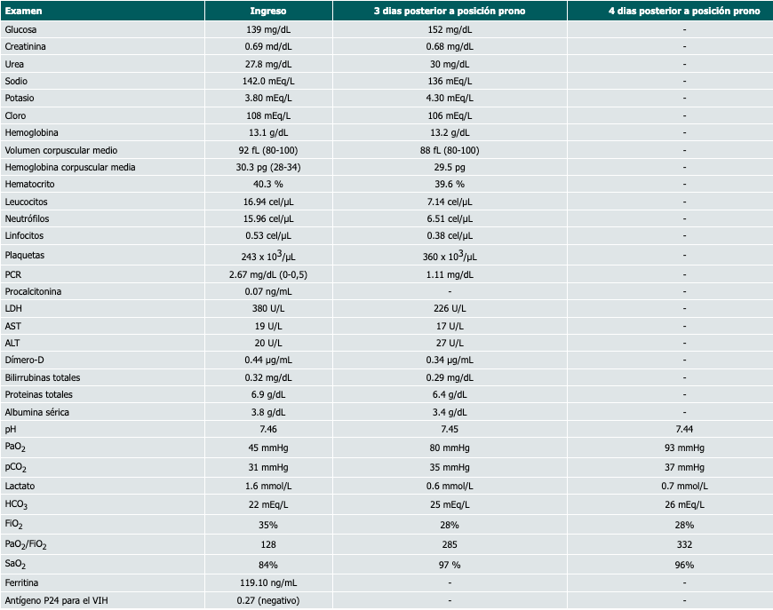 ng/mL:nanogramos/litro PaO2: presión parcial de oxígeno arterial; pCO2: presión parcial de dióxido de carbono; PCR: proteína C reactiva; pg: picogramo; pH: potencial de hidrógeno; SaO2: saturación de oxígeno; U/L: unidades/litro; VIH: virus de inmunodeficiencia humana; VSG: velocidad de sedimentación globular.