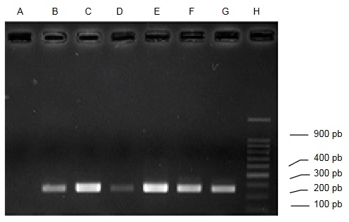 En el carril A se encuentra el control negativo (PCR con ADN de células HeLa), de los carriles B al F muestras clínicas aleatorias con amplicón de 241 pb, en el carril G se encuentra el control positivo, producto de PCR de 241 pb, que pertenece a la amplificación del ORF2 del plásmido de la cepa de C. trachomatis ATCC® VR-902B. Carril H, marcador de tamaño molecular de 100 pb (Biobasic™, Markham, Ontario, Canadá)