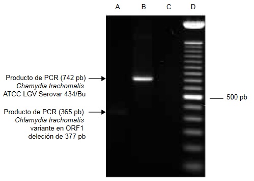 En el carril A se observa la cepa silvestre ATCC® LGV Serovar 434/Bu sin deleción en el ORF1 del plásmido críptico de C. trachomatis; en el carril B se observa la variante con deleción de 377 pb con un producto final de amplificación de 365 pb; en el carril C se encuentra el control negativo (PCR con ADN de células HeLa), y en el carril D se observa el marcador de tamaño molecular de 100 pb (Invitrogen™, CA, EE. UU.)