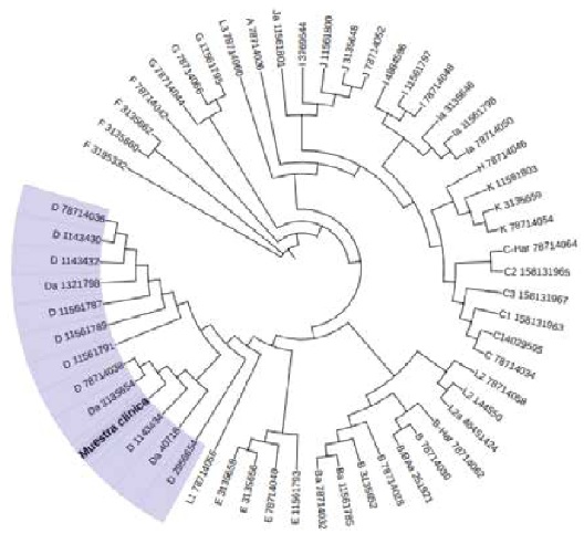 En la figura se muestra que la muestra clínica se incluyó en el cluster del patotipo genitourinario con base a las secuencias del gen pmpH registradas y publicadas en el GenBank