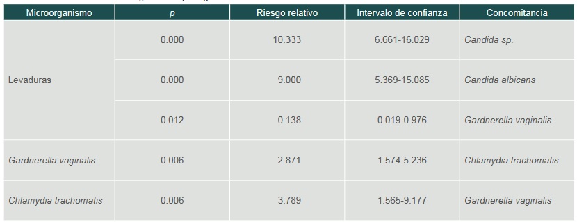 Paralelamente, además de la identificación de C. trachomatis por PCR se encontró que 12 muestras mostraron una coinfección con otros microorganismos como Streptococcus agalactiae, Candida sp. y E. coli, pero sin significancia. Sin embargo, se observó que existe una relación significativa con G. vaginalis (cuadro I).
