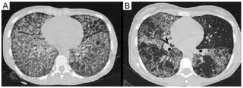 A. Tomografía computarizada de alta resolución (TACAR) que evidencia engrosamiento septal y opacidad en vidrio despulido bilateral, de predominio basal y parahiliar (patrón de pavimentación), así como bronquiectasias cilíndricas bibasales. B. TACAR ocho meses después del tratamiento con factor estimulante de colonia de granulocitos-macrófagos con disminución de afectación pulmonar
