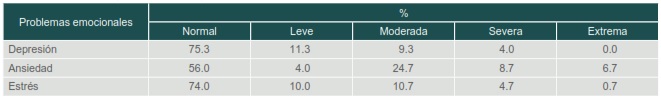 Se empleó el test de depresión, ansiedad y estrés desarrollado por Lovibond et al.22 en su versión corta de 21 reactivos, la cual es conocida como DASS-21. Cada escala (depresión, ansiedad y estrés) está compuesta por siete reactivos de tipo Likert en un rango de cero a tres, donde cero corresponde a la opción Nada aplicable a mí y el tres corresponde a la opción Muy aplicable a mí. Cada escala tiene su propio puntaje para interpretación; por ejemplo, la depresión se clasifica de la siguiente manera: de 0 a 4 puntos es normal, entre 5 y 6 puntos es leve, de 7 a 10 puntos es moderada, de 11 a 13 puntos es severa y de 14 a más se clasifica como muy severa. La ansiedad se clasifica de la siguiente manera: de 0 a 3 puntos es normal, de 4 a 5 puntos es leve, de 6 a 7 puntos es moderada, de 8 a 9 puntos es severa y de 10 a más se clasifica como muy severa. El estrés se clasifica de la siguiente manera: de 0 a 7 puntos es normal, de 8 a 9 puntos es leve, de 10 a 12 puntos es moderado, de 13 a 16 puntos es severo y de 17 a más se clasifica como muy severo.