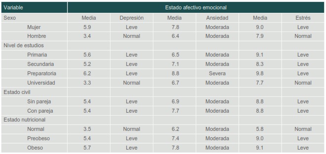 Conclusiones: en periodos de confinamiento los problemas mentales suelen agravarse, por lo que es necesaria la implementación de programas de apoyo emocional, sobre todo para el caso de las mujeres trabajadoras con problemas de obesidad, ya que ellas son el grupo más vulnerable ante esta situación.