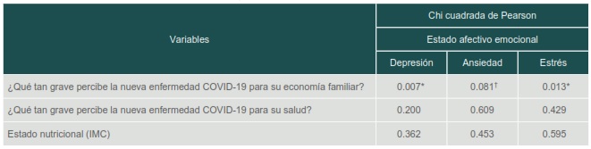 Se llevó a cabo un análisis de asociación mediante la prueba de chi cuadrada de Pearson para identificar si el estado afectivo emocional guardaba alguna relación con el estado nutricional, así como con las percepciones sobre daño a la salud y a la economía familiar, causado por la pandemia por el virus SARS-CoV-2. Los resultados se presentan en el cuadro V.