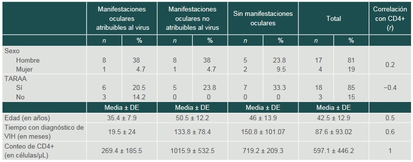 Resultados: se incluyeron 21 pacientes entre 26 y 67 años de edad. Solo tres no se encontraban en terapia antirretroviral. El 67% presentó algún tipo de manifestación ocular, 42% presentó manifestaciones no relacionadas con la infección, 47% manifestaciones relacionadas y 24% ambas. La microangiopatía de la conjuntiva fue la manifestación ocular más frecuente (35.7%). Hubo una correlación estadísticamente significativa (. = 0.76, . = 0.0001) entre las manifestaciones oculares relacionadas con la infección y el conteo de linfocitos CD4+.