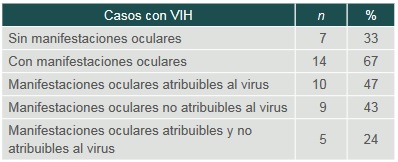 TARAA: terapia antirretroviral altamente activa; DE: desviación estándarEn 14 pacientes (67%) se encontró alguna manifestación oftalmológica. En los pacientes con manifestaciones oculares, estas se dividieron en aquellas atribuibles al virus y en no atribuibles, y estuvieron presentes en 10 (47%) y nueve (43%) de los casos, respectivamente. En cinco pacientes (24%) se encontraron ambos tipos de manifestaciones (cuadro II).