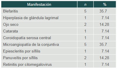 Entre las manifestaciones no atribuibles, la más frecuente fue la blefaritis, que se encontró en cinco casos (7.14%). Entre las atribuibles al virus, la microangiopatía de la conjuntiva fue la más frecuente y se encontró también en cinco casos (35.7%). La retinitis por citomegalovirus fue diagnosticada en uno de los casos (7.14%) (cuadro III).