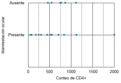 La presencia de manifestaciones oculares se correlacionó débilmente con el conteo de CD4+ (r = 0.4, p = 0.036) (figura 1).