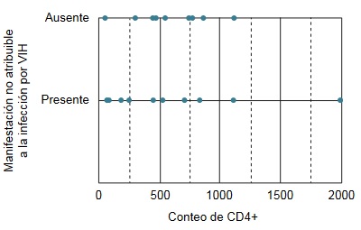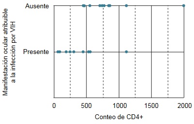 Las manifestaciones oculares atribuibles al virus se presentaron en casos con menor conteo de CD4+ (r = 0.763, p = 0.0001)Las manifestaciones oculares no atribuibles al virus se presentaron independientemente del conteo de CD4+ (figura 3).