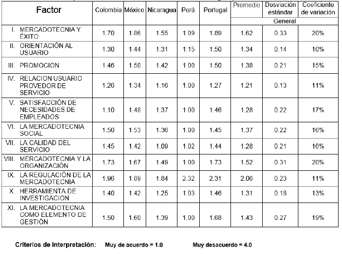 La aplicación de la mercadotecnia en los servicios de salud resulta favorecida con relación a su enfoque social en todos los países; la relación usuario proveedor y satisfacción de necesidades de los empleados ocupan lugares más cercanos al total acuerdo en los factores de todos los países; mientras que calidad del servicio y la orientación al usuario, tienen un lugar intermedio entre totalmente en acuerdo y algo de acuerdo; en lo que respecta a los factores de promoción de la salud y mercadotecnia social y en cada uno de sus ítems, no obtuvieron las mejores valoraciones.