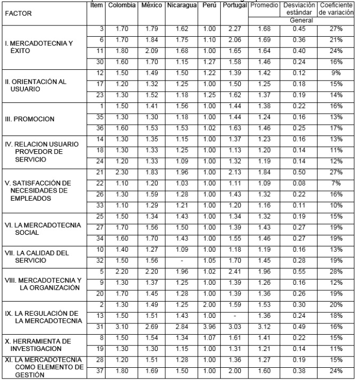 El análisis general de los factores en los países revela el mayor coeficiente de variación en los factores “I Mercadotecnia y éxito” y “VII Mercadotecnia y organización” con un coeficiente de variación de 20% y una desviación estándar de 0.33 y 0.31 respectivamente. La mayor diferencia se encuentra entre Perú, con total acuerdo y Portugal, México y Colombia a la valoración algo de acuerdo, mientras que Nicaragua se mantiene en el valor intermedio.