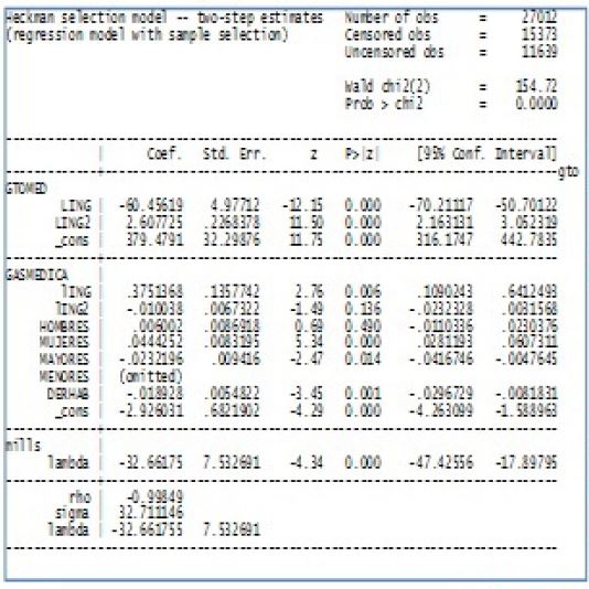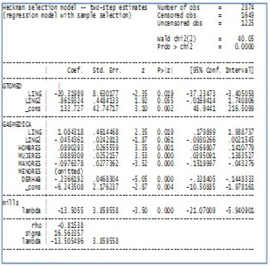 The first stage only indicates whether it occurred or not some drug spending (GASMED) and is based on the following characteristics: logarithm of common income (LING); The square of the logarithm of the common income (LING2); Male members of the household (HOMBRES); Female members of the household