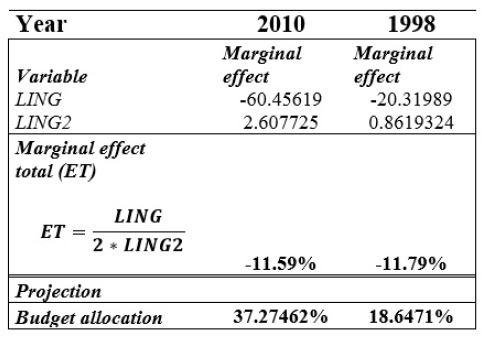 Using the projection results - for both years - the marginal effect was calculated to have the total marginal effect, which indicates the percentage of drug spending in households. According to the results of table 3, if the drug spending of a household income increases by 100% it is reduced by 11.79% in 1998, while in 2010 it drops in 11.59%. The estimation of this demand equation according to the theory of the consumer indicates that the introduction of generic and similar drugs has brought a wealth effect since 2010 households consume more medication, just as predicted; while in 1998 they had a budget allocation of 18.6%, in 2010 it almost doubles to 37.3 %.
