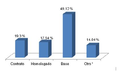 El grupo de edad que predominó fue de 36 a 45 años (38.60%); 78.95% es mujer y 45.61% tiene licenciatura. El 24.56% del personal es del área administrativa, 35.09% de enfermería, médicos (31.58%) y otros (8.77%). El 49.12% tiene base y 14% otro tipo de relación laboral (Gráfica 1).