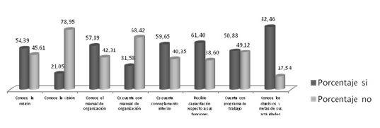 El 54.39% conoce la misión, 21.05% la visión y 57.89% el manual de organización (Gráficas 2 y 3).