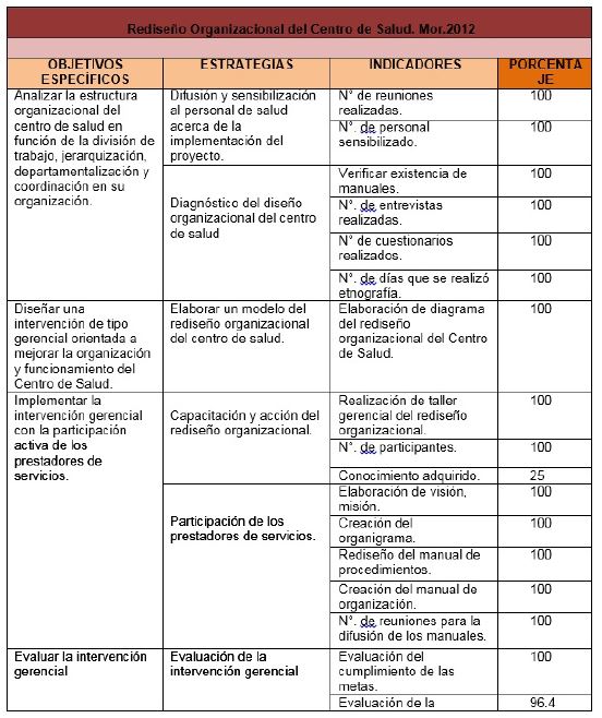 Para este estudio trabajamos una intervención constituida por cuatro elementos: el diagnóstico, el diseño, la implementación y la evaluación del diseño e implementación, que básicamente pretendió ser un instrumento para mejorar el diseño organizacional del centro salud. Al igual que Obando (2010), creemos que las intervenciones como éstas, contribuyen a la planeación estratégica, que promueve la mejora del proceso de atención.23