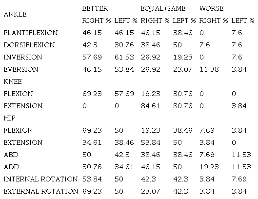 The results of the measurement in the plantiflexion show that there really were no changes. In almost all cases the percentage was maintained, however, we see that in the left lower extremity there was an increase in this. Regarding dorsiflexion, there is an increase in the right lower extremity, but it is striking that the left side remains largely unchanged in half of the participants. Inversion and eversion undergo a major change towards improvement. Few were the participants who had worsening in these arcs of movements. In flexion of the knee improvement in knee flexion of both lower limbs was observed. Although the extension remains the same in a good percentage. As for the hip flexion of the right pelvic member is the same as in the left. In the extension this arc of movement of the left hip remains the same in 50% of the participants and in 53.84% remains on the right side. In the abduction and internal and external rotations there is an increase towards the improvement of these arcs and in the adduction remains unchanged in almost 50% in both lower extremities table 1.