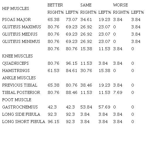 Resultados: Houve uma tendência de melhora na flexibilidade do quadril, joelho e tornozelo principalmente, a extensão do joelho permaneceu a mesma, 84,61% direita e 80,76% para a esquerda. A extensão do quadril esquerdo permanece igual em um 50% e 53,84%, no lado direito. A força muscular aumentou geralmente em todos os grupos musculares de ambas as extremidades inferiores. O trofismo de coxas aumentou em diâmetro, pantorilha em um 46% e mais do 50% mantiveram diâmetros semelhantes. Alguns dos AM perderam peso, pelo que os seus diâmetros diminuíram.