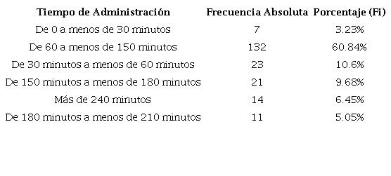 El tiempo de transfusión se describe en la tabla 2, donde se observa que el mayor número (n- 132) de hemo componentes se trasfundió en 60 a 150 minutos. Se observa que una menor cantidad de hemo componentes se trasfundió en un tiempo mayor a lo establecido.
