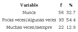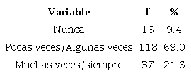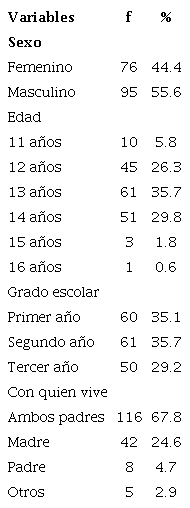 En cuanto a los datos sociodemográficos se obtuvo que el 55,6% de los adolescentes de secundaria eran del sexo masculino, la edad que más prevalece es la de 13 años con un 35,7% seguido de los 12 años con el 26,3%. Respecto al grado escolar, el 25,7% son alumnos del segundo grado, el 35,1% son alumnos del primer grado y el 29,2% son alumnos del tercer grado. Dentro de los datos que se muestra sobre con quien vive el adolescente el 67,8% refiere que vive con ambos padres tabla 1 y 2.