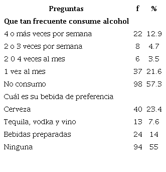 Se aplicó la Cédula de Datos Personales y Prevalencia de Consumo de Alcohol (CDPPCA); la primera realizaba los cuestionamientos de sexo, edad, grado escolar y con quien vive. En el segundo apartado se indagaron los tipos de prevalencia de consumo de alcohol, global, lápsica, actual e instantánea, la cantidad de consumo de alcohol y la bebida alcohólica de preferencia. El Cuestionario de Afrontamiento Familiar (CAF)8, analiza los recursos de afrontamiento de la familiar ante el estrés, y entre estos recursos, estudia el apoyo social de la comunidad, los amigos y vecinos, las estrategias en la resolución de los problemas, la evaluación que la familiar del estresor, el apoyo espiritual y la inclinación a pedir ayuda. Está constituido por 21 ítems ha presentado una consistencia interna del de .74 alfa de Cronbach. Está conformado por dos dimensiones, los Patrones Internos del Afrontamiento Familiar que incluye la confianza de la familia en la solución de los problemas, la reestructuración de los problemas familiares y la pasividad familiar en las situaciones difíciles siendo las subescalas: Reestructuración (ítems 3, 8, 9, 11, 14 15, 16) y Evaluación Pasiva (ítems 13, 17, 19) y la segunda dimensión Patrones Externos del Afrontamiento Familiar abarca los recursos provenientes de instituciones seculares, el contexto social compuesto por los amigos, los vecinos y la familia extensa y los recursos de la comunidad, conformado por: Apoyo Amigos y Familiares (ítems 1, 2, 4, 12), el Apoyo Espiritual (ítems 10, 18, 21), el Apoyo Formal (ítems 5 y 6) y Apoyo Vecinos (ítems 7 y 20). Para su evaluación se clasifico en estrategias internas y estrategias externas del afrontamiento familiar, las puntuaciones se suman y se obtienen totales que delimitan estrategias internas (10 a 23 nunca, 24 a 37 pocas veces/ algunas veces y 38 a 50 muchas veces/siempre) y estrategias externas (11 a 25 nunca, 26 a 40 pocas veces/algunas veces y 41 a 55 muchas veces/siempre).