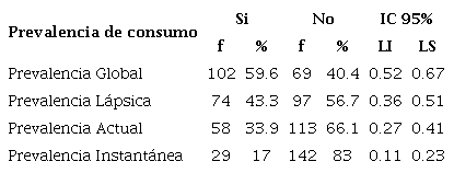 La tabla 3, se muestra la frecuencia de la prevalencia de consumo de alcohol teniendo la prevalencia global con un 59,6%, IC 95% [0,52-0,67]; la prevalencia lápsica con el 43,3% IC 95% [0,36-0,51]; la prevalencia actual con el 33,9% IC 95% [0,27-0,41] y con el 17% IC 95% [0,11-0,23] la prevalencia instantánea.