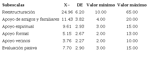 Se presenta la estadística descriptiva de las dimensiones del instrumento Afrontamiento Familiar en la tabla en donde la subescala de reestructuración tiene una media de 24.96 con una desviación estándar de 6.20, asimismo se observa una media de 11.43 en la subescala de apoyo de amigos y familiares con una desviación estándar de 3.82 tabla 4.