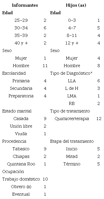 Aunque no se entrevistó a las/los niños enfermos de cáncer, a través del discurso de sus madres y padres se recuperó la información acerca de sus datos socio-demográficos y algunos relacionado con el problema de salud. En este sentido se encontró que los niños más afectados fueron los varones con edades entre los cuatro y once años, y el diagnóstico más frecuentemente mencionado fue la leucemia linfoblástica Aguda (LLA). En todos los tratamientos se usó la quimioterapia y las etapas de éste en la que se encontraban fueron en su mayoría al inicio y al término tabla 1.