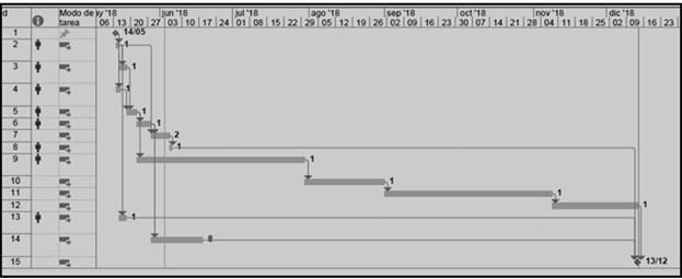 La programación de las actividades del proyecto en el tiempo, su duración y actividades críticas, se muestra en la figura 2.