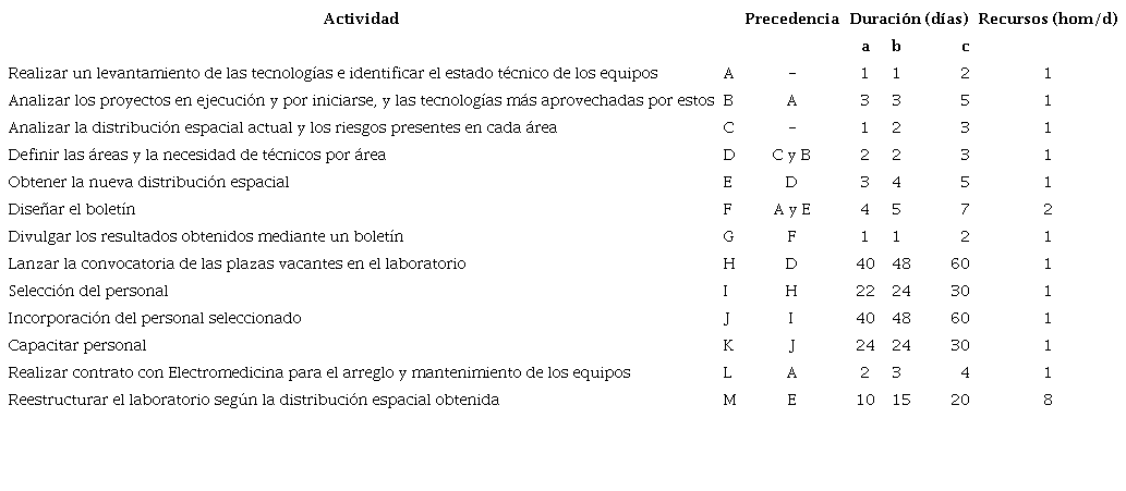 La precedencia y la determinación de los tiempos se basó en la consulta de proyectos técnicos e investigativos de similar objetivo; y los criterios de especialistas sobre la duración aproximada de las actividades según su naturaleza y complejidad.