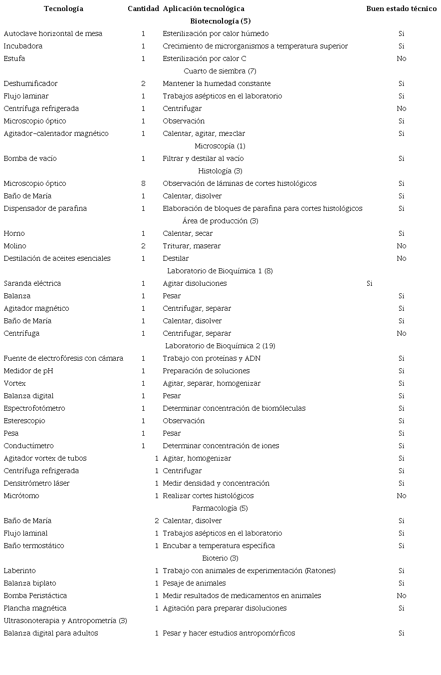 Se listaron 62 tipos de tecnologías, con la cantidad de equipos por cada una y su aplicación tecnológica; la tabla 2 muestra un fragmento de este levantamiento; en cada área se refleja el total de tecnologías identificadas1.